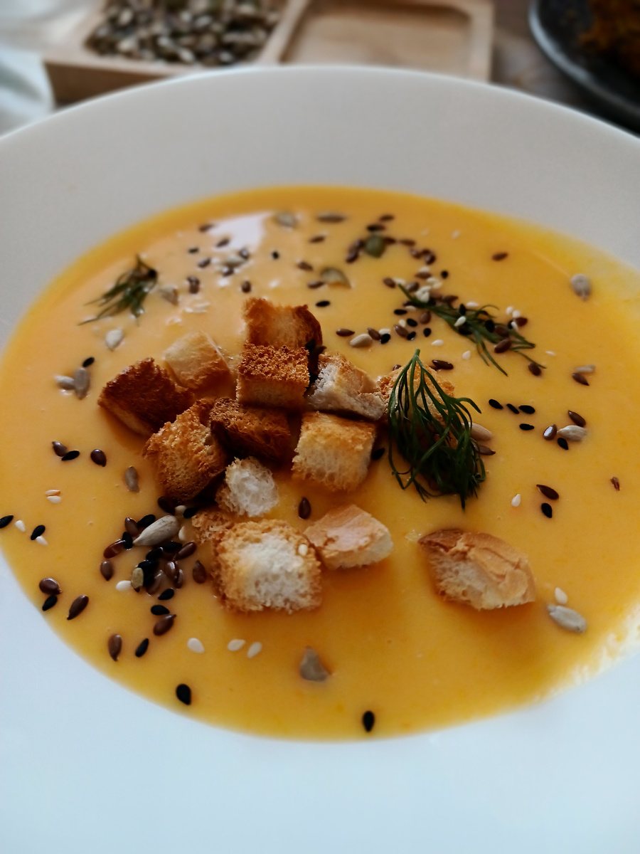 Разливаем суп по тарелочкам, добавляем семена, сухари и зелень.