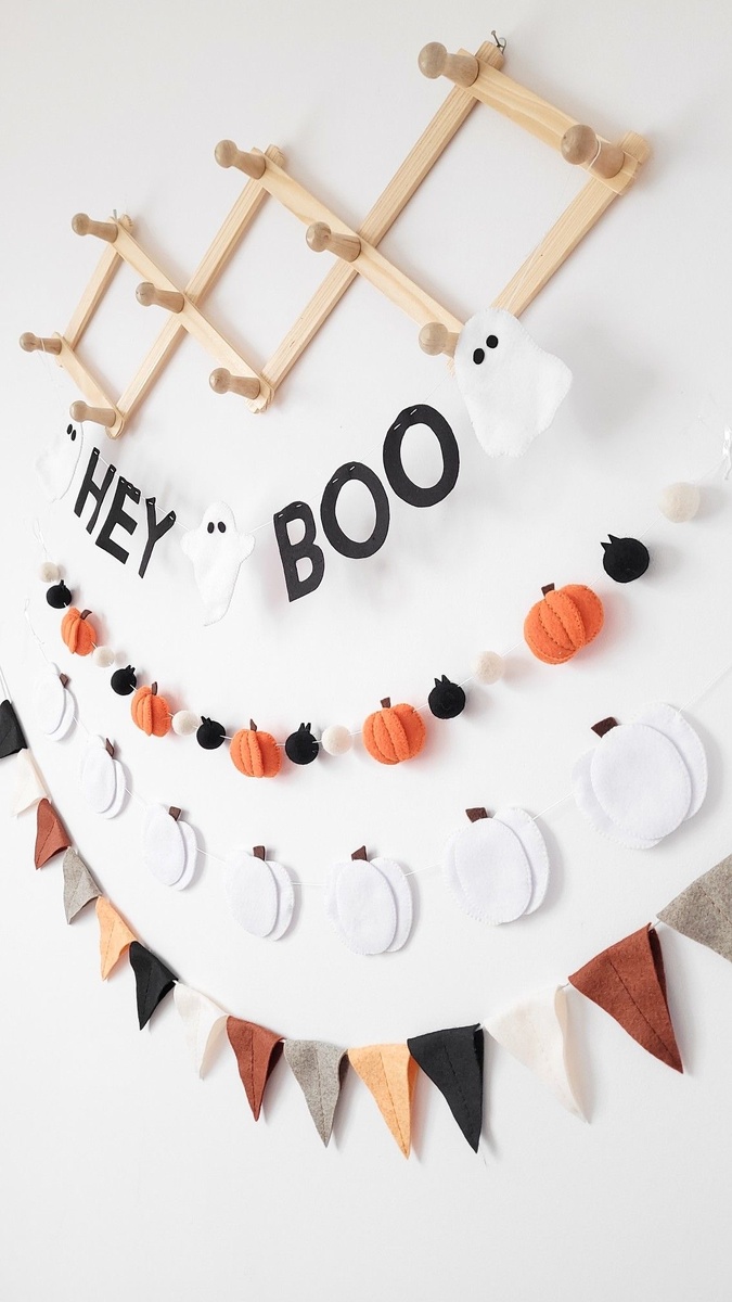 Гирлянды из бумаги или ткани / фетра — одно из самых простых и эффектных украшений. Вырежьте из черной и оранжевой бумаги силуэты тыковок, котиков, паучков, летучих мышей и привидений. Свяжите их ниткой или лентой и повесьте на стенах, окнах или дверных проемах.