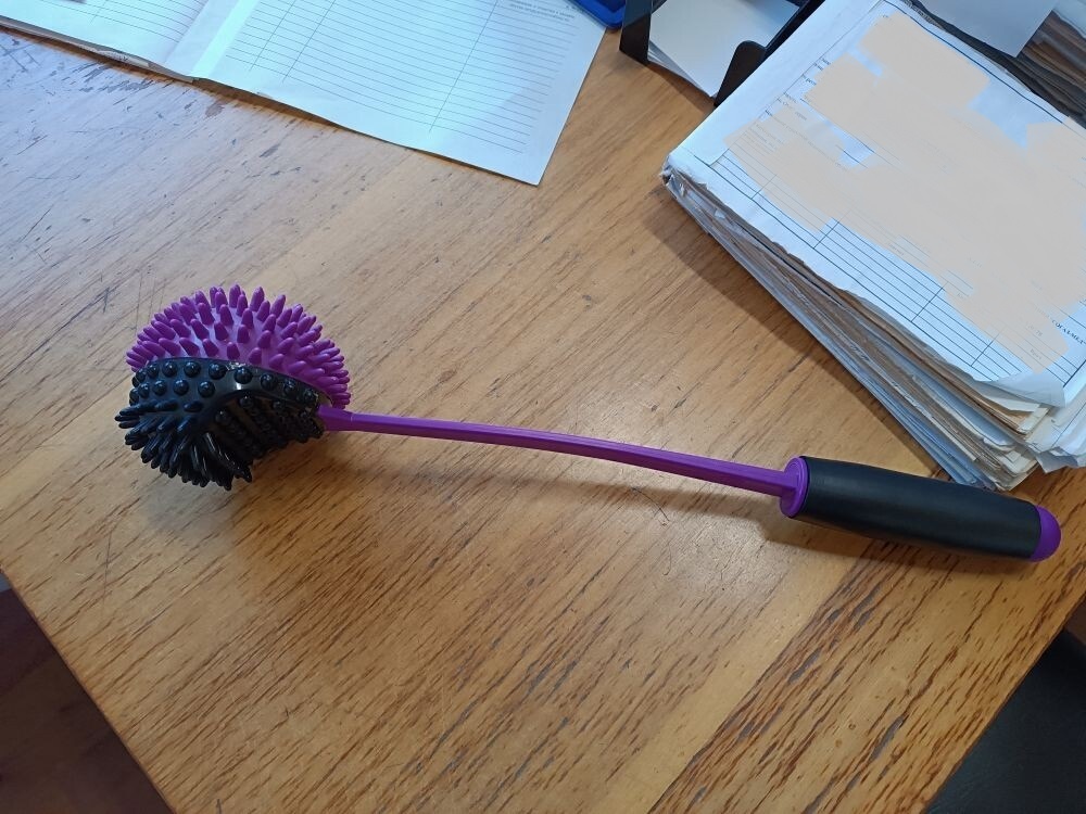 Ну что... К врачу вчера я сходила. Как и писала, лечение, которое мне назначено, сюрпризом не стало: физиотерапия плюс уколы. Всё знакомо) Направления на МРТ доктор не дал. Сказал, мол, это требуется тем, кому предстоит операция. Мне, слава Богу, операция пока не нужна. А диагноз и так очевиден - для невролога. Так что лечись, Тоня, и не дёргайся) Кстати, у самого доктора в кабинете под рукой лежит... занятная такая палка) И он этой палкой себя периодически лупит по спине) Прямо на глазах у пациентов. Это такая наглядная демонстрация дополнительного (и, видимо, эффективного) метода лечения. Ага) Говорит: - Один идёт - жалуется на боли, второй идёт жалуется... Чувствую, и у меня, вроде, заболело. Беру палку и бью себя посильнее. Сразу легче становится. В общем, я тоже решила, что мне такая палка нужна) Сфотографировала это лечебно-пыточное орудие: А когда домой вернулась, нашла этот гаджет на маркетплейсе и заказала. Называется палка, кстати, массажёром игольчатым, или мячом массажным.