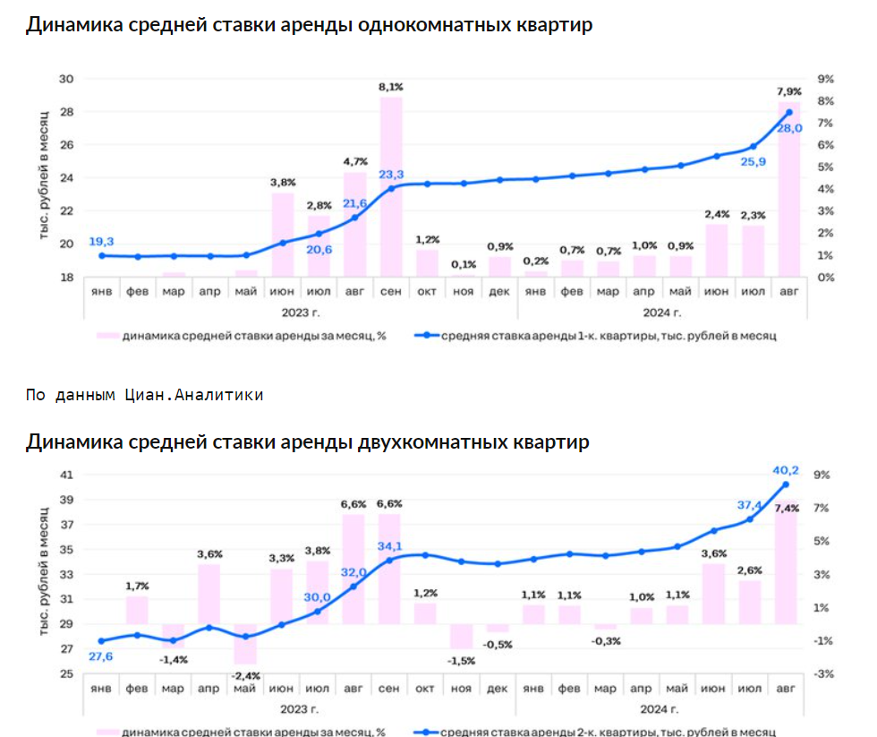 Ну что, ребята, поздравляю - у нас наступила осень 2024 года. Помните, нам некоторые обещали, что стоимость аренды жилой недвижимости вырастет в 2!!! раза? Ну вот и давайте посмотрим, что происходит сейчас на самом деле. И куда мы в итоге идем. Если говорить о конкретных данных, то в сентябре 2024 года средняя стоимость аренды однокомнатной квартиры в Москве составит около 40 тыс. рублей. рублей в месяц. Это на 15% выше, чем в сентябре 2023 года. А по ЦИАНу даже меньше - 7-8%. При этом спрос на аренду жилья остается высоким, предложение растет не так быстро, как хотелось бы. Во-первых , огромное количество людей переехало в Россию из других стран, и многие из них ищут жилье в аренду. Это повышает спрос и, следовательно, увеличивает цены. Во-вторых , в России сложная ситуация с ипотекой. Ставки высокие, а многие боятся брать кредит в условиях неопределенности. Поэтому для аренды остается легким и доступным соглашением. В-третьих , строительство нового жилья в России замедлилось, а э
