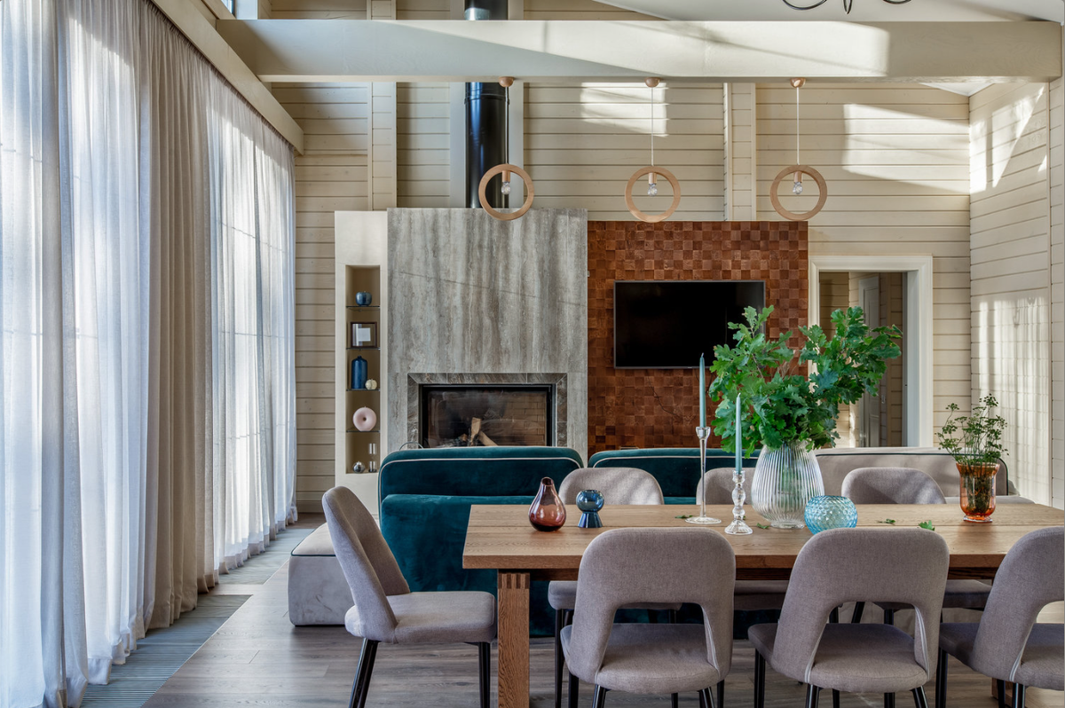 Сегодня покажу, как можно создать стильный, уютный дом без астрономических затрат — да еще и с изюминкой. Итак, перед нами одноэтажный дом из клееного бруса на 215 квадратных метров, уютно расположившийся в лесах Самарской области. Перед дизайнером Евгенией Шимкевич стояла задача: минимум затрат, максимум эффекта, и без долгого ожидания заказанных материалов. Думаете, что эта миссия невыполнима? Давайте посмотрим. Мечты о ярких красках Этот дом задумывался как дача для выездов на выходные и праздники. Заказчики, семейная пара с детьми, захотели «сбежать» от скучных серых тонов городской квартиры и поэкспериментировать с цветом. Их просьба звучала примерно так: «Побольше яркости, но без лишних затрат». Звучит просто, да? Ну, как бы не так. Кухня — главный герой этого интерьера. Хозяйка давно мечтала о кухне цвета драгоценных камней, конкретно — изумруда. Все бы хорошо, но тут случился небольшой казус. Евгения, дизайнер проекта, рассказывает: «Заказчица мечтала об изумрудной кухне. Но пр