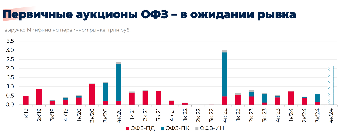 Сегодня Минфин проведет заключительные первичные аукционы 3к’24. С начала квартала ведомство привлекло 594 млрд руб. выручки, что соответствует темпу в 50 млрд руб. за аукционный день. Готовясь к вступлению в насыщенный 4к’24, мы обращаем внимание на следующие темы, важные для участников долгового рынка: