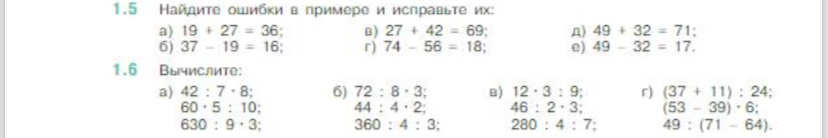 В задании 1.5 нам предлагают найти ошибки в примерах и исправить их. Мы будем просто правильно считать и после знака равно ставить нужную цифру. А в задании 1.6 предлагают произвести вычисления. И так задание 1.5 , поехали: а) 19+27=46 б) 37-19=18 в) 27+42=69 г) 74-56=18 д) 49+32=81 е) 49-32=17 Задание 1.6 а) 42:7•8=48 60•5:10=30 630:9•3=210 б) 72:8•3=27 44:4•2=22 360:4:3=30 в) 12•3:9=4 46:2•3=69 280:4:7=10 г) (37+11):24=2 (53-39)•6=84 49:(71-64)=7 Ну вот и все!Всем удачи! Напишите в комментарии, чего не хватает в статье!