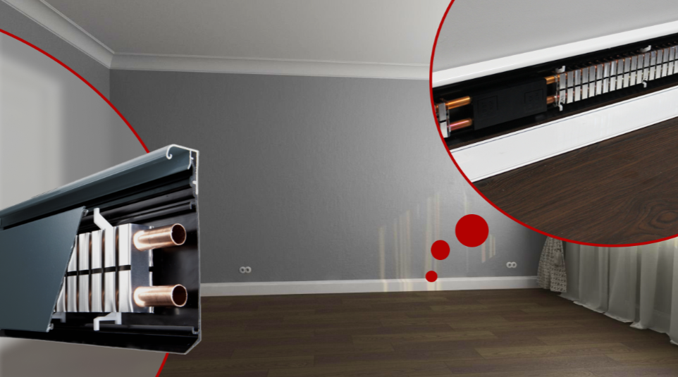 Работает теплый плинтус по принципу, отличному от обычных радиаторов. Лишь 20% тепла расходуется на конвекцию, а основная часть идет на нагрев стены. Тепло сначала поднимается от плинтуса вдоль стены, нагревая её.