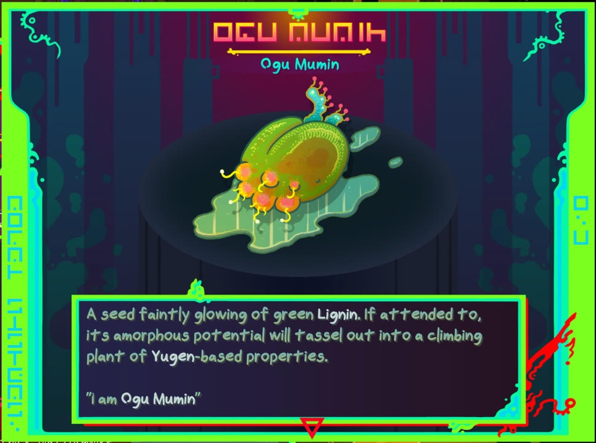 По виду это что-то странное, какая-то лоза. Позволяет ломать собой преграды и ловушки. Ключевой особенность является то, что оно бесконечно растет в оранжевой жидкости, что позволяет делать длинные цепочки, на которые можно цеплять разные цветы, типа колючек Staccati, чтобы прокладывать связь. При контакте с другими растениями или с самим собой, в месте самого контакта, вырастает фрукт. По сути само по себе оно практически бесполезно, но в связке с другими растениями имеет очень большой простор для ваших идей.