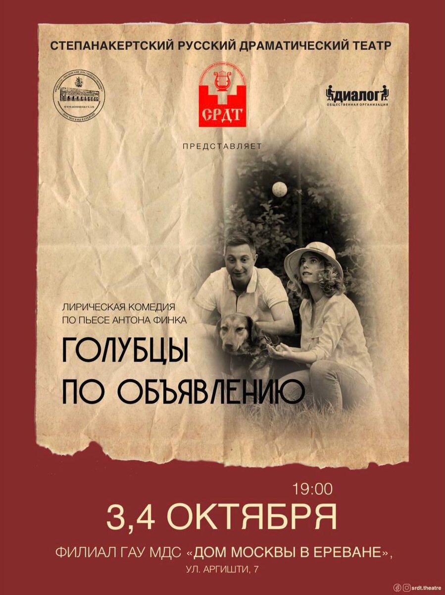 Важно отметить, что в течение этого года арцахцы успели представить ереванскому зрителю четыре полноценных спектакля, которые прошли с большим успехом. А спектакль "Голубцы по объявлению" уже входит в постоянный репертуар Степанакертского русского драматического театра. Ссылка на билеты: https://www.tkt.am/ru/golubcy-po-obieiavleniiu-stepanakertskii-russkii-dramaticeskii-teatr-04-oct-2024/eid/1417/group/1