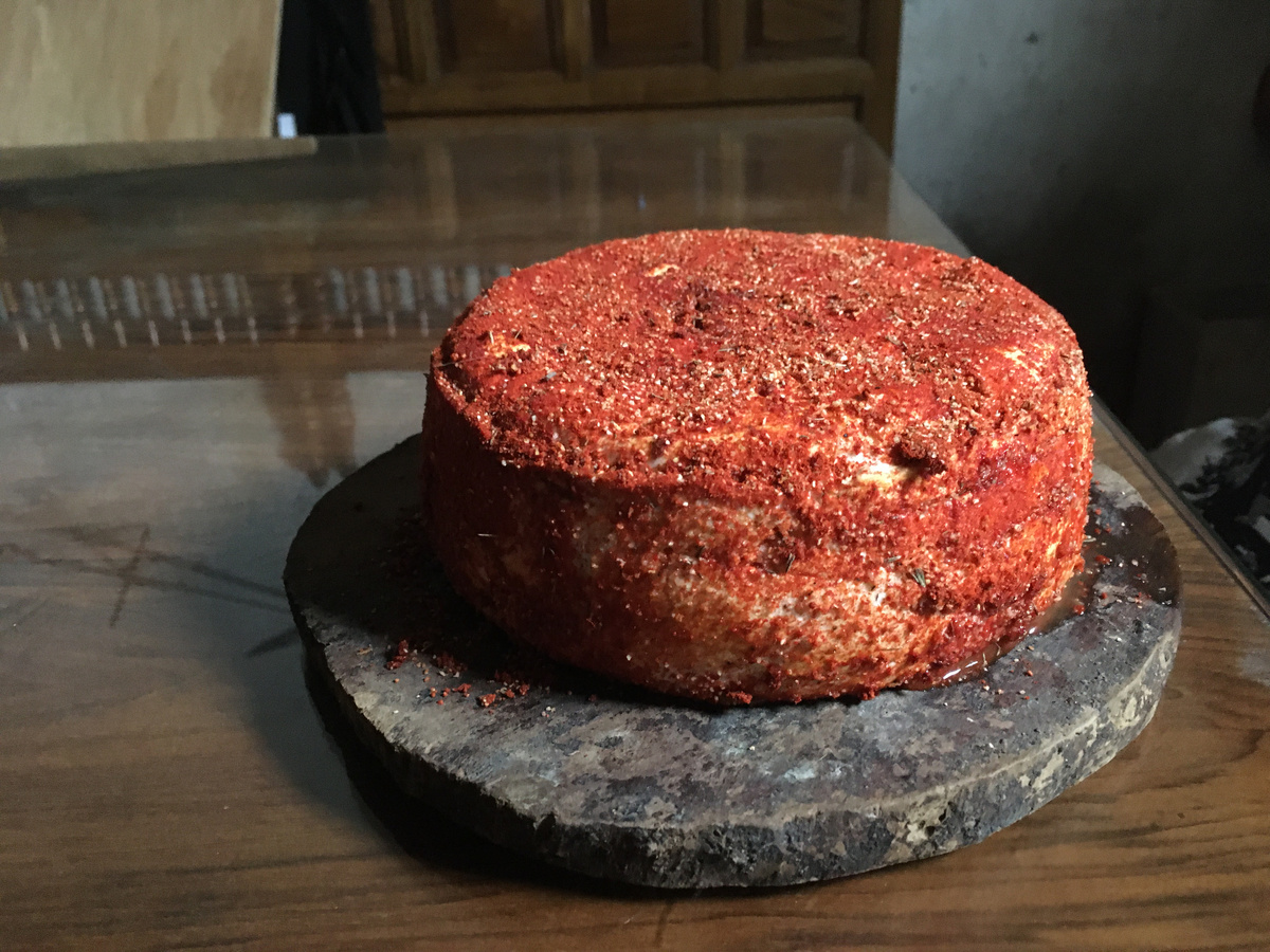 На фото - козий сыр, который мы сделали самостоятельно, сквасив молоко ферментом. Снаружи обсыпали смесью из красного перца (пиментон) и других специй. Это было божественно.