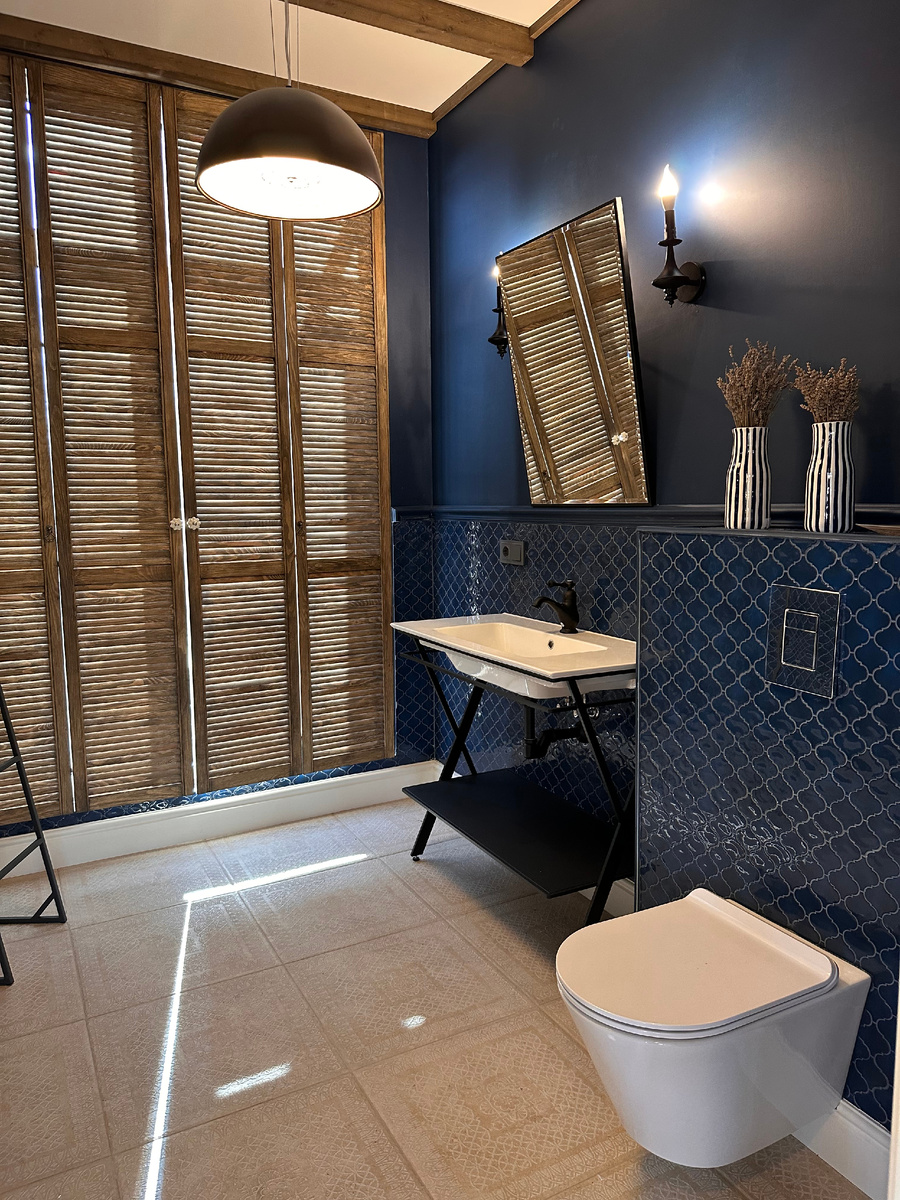 Проект реализован в Сочи, на территории коттеджного посёлка в средиземноморском стиле. Просторный дом, в котором общая площадь керамической выкладки составила более 200 кв. м, позволил применить множество дизайнерских решений – а также целый ряд серий плитки и керамогранита. В том числе в интерьере использованы выкладки из синей мозаики «Арабески майолика»: такой дизайн связан с водной стихией, а майоличный цвет позволяет даже на большой площади создать покрытие, которое выглядит эффектно и разнообразно.