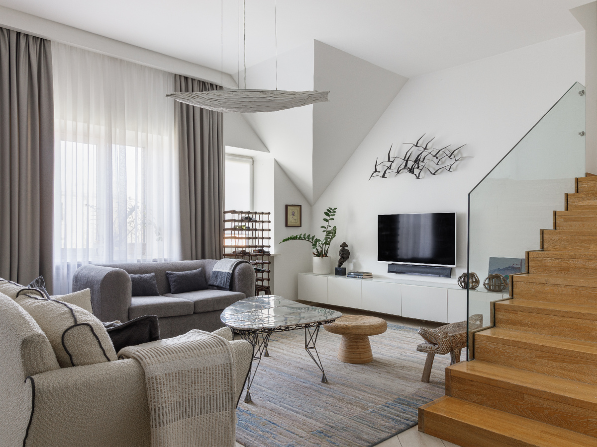 Проектируя дизайн собственной квартиры, Вера Белова создала настоящий интерьерный холст, на котором встретились винтажные и эксклюзивные вещи от современных творцов. Светлый и парящий образ пространства с использованием натуральных материалов помог раскрыться самобытным арт-объектам. Проект этой двухэтажной квартиры планировался как фон для искусства, гранями которого стали светлые стены, потолок и пол. Для этого в отделке и мебели было использовано множество элементов из стекла, подчеркивающих воздушность обстановки. В зоне столовой это вставка в столешнице обеденного стола, облегчающая композицию, на лестнице — ограждение, благодаря которому вырисовываются чистые линии в интерьере, а также стеклянный угол в ванной, выглядывающий в пространство гостиной и работающий как большой ночник по вечерам. В последней стена и часть пола выложены мозаикой из натуральных голышей, ванна и раковина втоплены в столешницы из кварцевого агломерата, не нарушая стилистической целостности. По такому же п