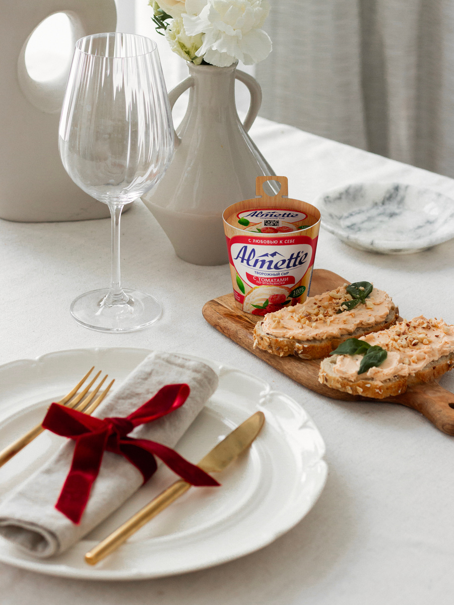 Сегодня расскажем, как поддержать элегантный тренд на банты в сервировке, чтобы еще больше насладиться моментами с Almette. Повяжите тонкую ленту на бокалы, приборы, подсвечники или тканевые салфетки. Подберите тон ленты так, чтобы он сочетался с другим декором или блюдами. Например, с баночкой Almette по-итальянски комплиментарно смотрится бантик из красного бархата. Такой изящный нюанс сделает сервировку романтичной, даже если у вас свидание с самой собой.