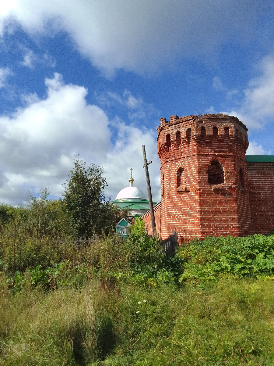 Церковь, о которой идет речь, поставил богатый, обладавший обширными владениями, множеством деоевень и внушительным богатством, помещик Марков. На сооружение храма он получил разрешение Епархии. В округе не было храма, а храм был нужен. Но при его строительстве возник земельный скандал. С повеления Маркова была затронута часть земли его соседа, прапорщика Колокольцева. По большому счету, землевладелец Колокольцев был беднее церковной крысы, имевший в собственности лишь одну деревеньку.. В ней и проживали его немногочисленные крепостные. Марков тайно снес эту деревню, самовольно порушив крестьянские дворы, останки которых, по всей видимости, сжег. Для порудчика это был удар. Колокольцев подал жалобу в святейший Синод. Он не был против церкви, но просил не затрагивать его владения. Воздвижение храма приостанавливалось, но, в конечном итоге, в 1740 году благополучно зааершилось. А Колокольцев и без того бедный, раззорился, потеряв источник дохода. Наверное, недобрым словом он отзывался о Маркове и его деятельности. Нам не веданы мысли несчастного прапорщика, но тем не менее, ни один из объектов монастыря не пострадал даже после 1917 года, кроме Воскресенской церкви, внезапно сгоревшей еще до революционных событий..