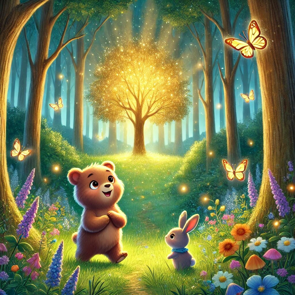 Мишка и зайчонок с радостью согласились, и сова повела их к Волшебной Поляне. Там росли необычные цветы, которые светились в темноте, а над поляной летали бабочки с разноцветными крылышками. Но самое удивительное — в центре поляны стоял Золотой Дуб, который исполнял одно желание того, кто пришел с чистым сердцем.