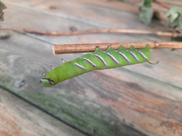 Выходишь в сад - а там одни вредители. Под каждым листиком притаились, из каждой трещинки на коре готовы вылезти. Как надоели эти колорадские жуки, малиново-земляничный долгоносик, эти цветоеды, бабочки-капустницы, тля, слизни и прочая дрянь! Только и смотри, кто там еще завелся. У некоторых садоводов нечто вроде профессиональной подозрительности образуется. Увидел на растении что-то мелкое - хвать опрыскиватель в руки и давай обработку проводить. А ведь в экологических сообществах, одним из которых является сад, больше полезных и нейтральных насекомых и прочих мелких обитателей, чем вредителей. Мы их даже не замечаем обычно - ползают там какие-то. Но за гусеницами присматриваем, ибо гусеница обязательно что-нибудь сожрет. Если появится гусеница исключительных размеров, сразу вопрос: это не нашествие? Увидев эту красотку, я сразу побежала. Не за опрыскивателем - за телефоном. Нельзя же такую модель без фотосессии отпустить. Гусеница размером в половину моей ладони оказалось мягкой, п