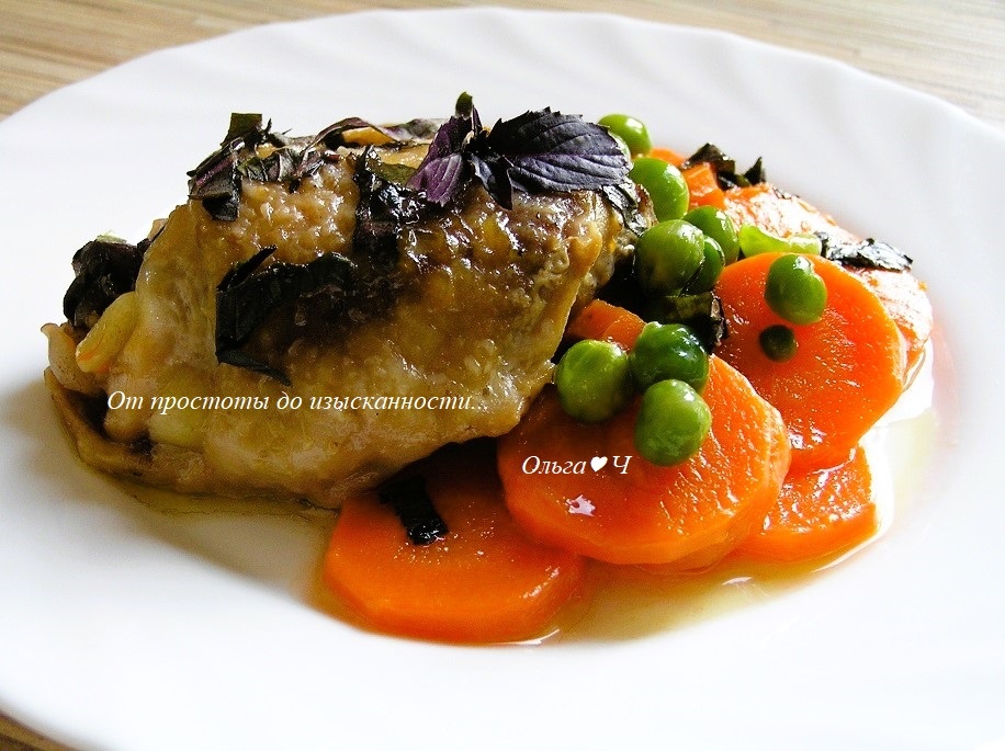 веточка базилика Приготовление: Курицу посолите, поперчите, посыпьте мукой и обжарьте на растительном масле до румяной корочки. Добавьте крупно нарезанную морковь, тушите 20 минут. Затем добавьте горошек, тушите еще 10 минут. Добавьте нарезанный базилик, посолите, поперчите. Через 5 минут снимите блюдо с огня. Подавайте к столу! Приятного аппетита! Вам также могут понравиться: