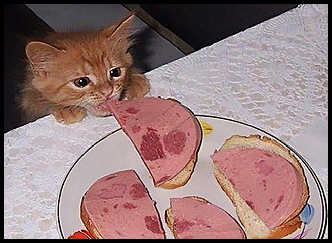 А что это тут у нас? О, бекончик! Солененький, вкусненький, с хлебушком. Так, это для меня оставили или просто доесть забыли? Вроде бы нет никого. Значит, для меня! Ну а чо я тогда теряюсь? Надо брать, а то вдруг вспомнят и отберут. Надо брать!