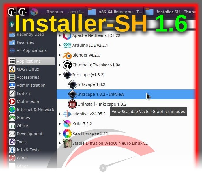 Пожалуй на этом можно заканчивать, найти Inkscape в формате автономного установочного пакета Installer-SH можно в репозитории GitHub: https://github.com/Shedou/Chimbalix-Software-Catalog