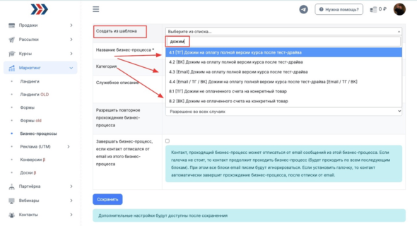 - Выбираете готовый шаблон в разделе «Бизнес-процессы».