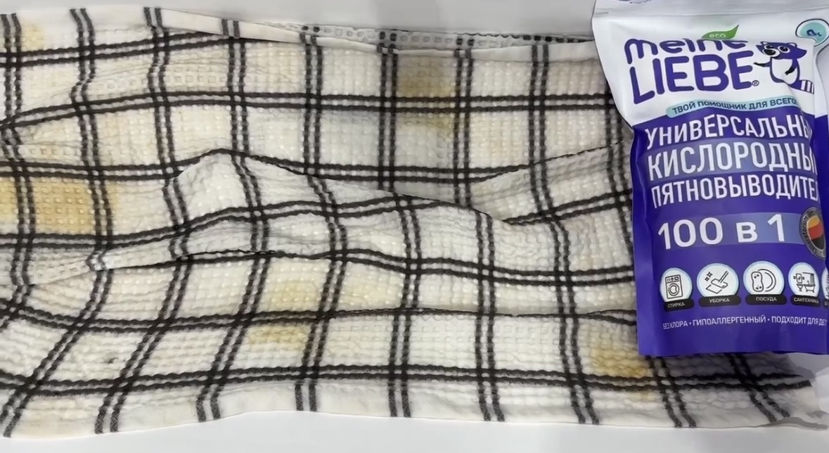 У нас дома отбеливатели появились после рождения детей, потому что повседневные пятна сменились на трудновыводимые. Морковное пюре, трава, шоколад, то с чем приходится сталкиваться теперь практически ежедневно. Я решила попробовать универсальный кислородный пятновыводитель meine liebe. Он оказался очень эффективным для свежих пятен. Но пришло время попробовать вывести застарелые пятна. И результат я покажу на старом полотенце. Пятновыводитель выглядит как порошок, внутри имеется мерная ложка, отдушки нет. Это действительно универсальное средство, которое можно использовать для одежды, мебели, посуды, ванной, ковров и вообще в быту. Для применения достаточно одной мерной ложки. Заливаем пятновыводитель кипятком и ждём примерно 30 минут, затем стираем в машинке либо на руках. Для свежих пятен достаточно будет 15 минут. Это средство без запаха, даже после добавления кипятка, что меня очень радует. Проветривать квартиру после каждого использования я не хочу. После стирки не осталось и сл
