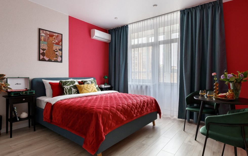 Маленькая студия 25 м² с малиновыми стенами и разнообразным декором