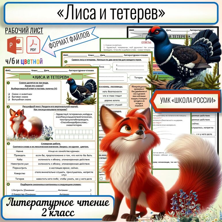Рабочий лист "Лиса и тетерев" 2 класс. Литературное чтение. Русская народная сказка с ответами для учителя. Можно редактировать Задания размещены на 2-х листах ( можно использовать двухстороннюю печать для экономии бумаги) ДВА ФАЙЛА ДЛЯ ПЕЧАТИ НА ВАШ ВЫБОР : ЦВЕТНОЙ И ЧЕРНО-БЕЛЫЙ. Формат pdf и формат pptx ( с возможностью редактирования файла) Иллюстрации в высоком разрешении. Рабочий лист состоит из 8- ти заданий , рефлексии+ лист с ОТВЕТАМИ для учителя. Ознакомиться и приобрести можно здесь