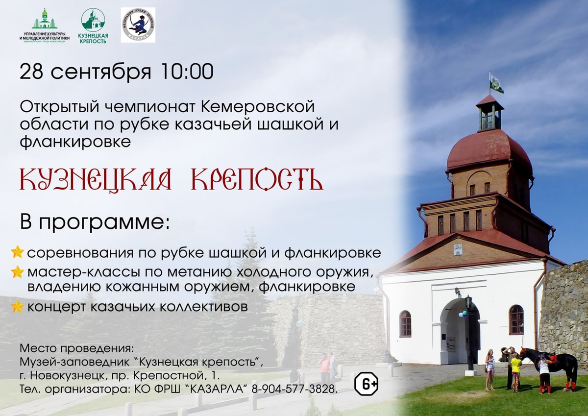 На территории новокузнецкого музея-заповедника «Кузнецкая крепость» 28 сентября состоится открытый чемпионат по Кемеровской области по рубке казачьей шашкой и фланкировке. Кроме самих соревнований для посетителей мероприятия пройдут мастер-классы по метанию холодного оружия, владению кожаным оружием, а также концерт казачьих коллективов.