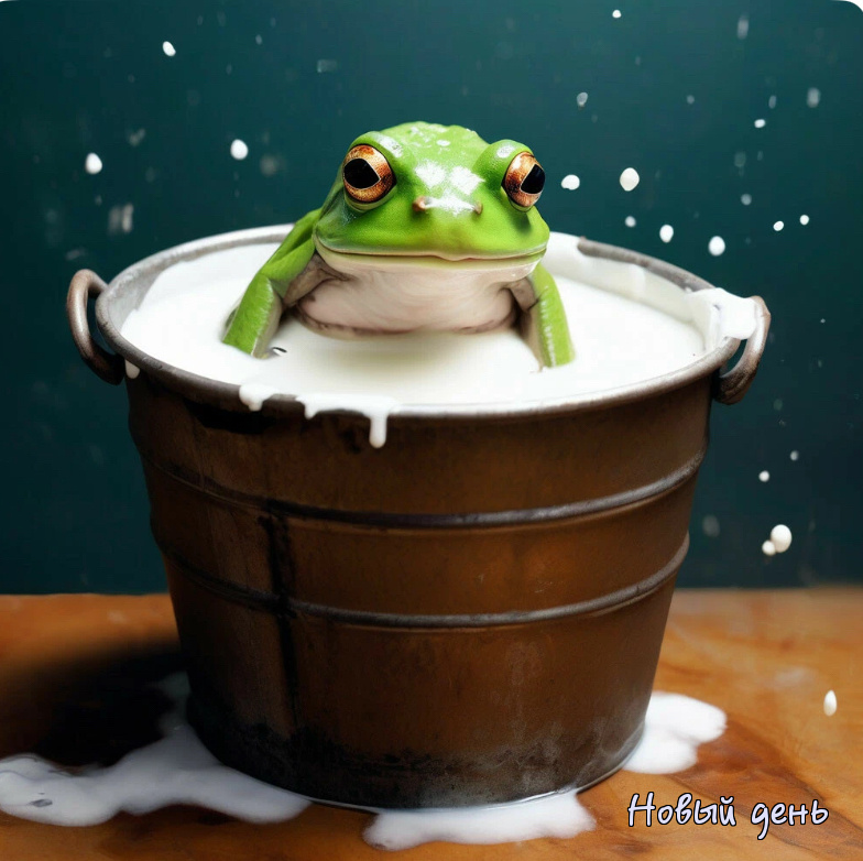Однажды в тихом пруду жила лягушка по имени Ляля. Она была очень любопытной и всегда искала приключения. Однажды, прыгая по берегу, Ляля наткнулась на ведро, полное свежего молока. Ведро стояло на солнце и светилось, как маленькое озеро. — Ого, какое большое ведро с молоком! — воскликнула Ляля. — Надо попробовать! Она прыгнула в ведро и с удовольствием начала плескаться в молоке. Лягушка была в восторге: молоко было мягким и вкусным, как сливки. Она решила, что это идеальное место для отдыха. Но вскоре Ляля поняла, что выбраться из ведра не так-то просто — стенки были слишком высоки! — Ой-ой, что же делать? — запаниковала Ляля. — Я не хочу оставаться в этом молоке навсегда! Она начала прыгать, пытаясь выбраться, но каждый раз скользила обратно. Вдруг мимо проходила старая черепаха по имени Тортилла. — Привет, Ляля! Что ты делаешь в ведре с молоком? — спросила Тортилла, удивленно глядя на лягушку. — Я застряла! Помоги мне выбраться! — закричала Ляля. Тортилла, улыбнувшись, ответила: — З