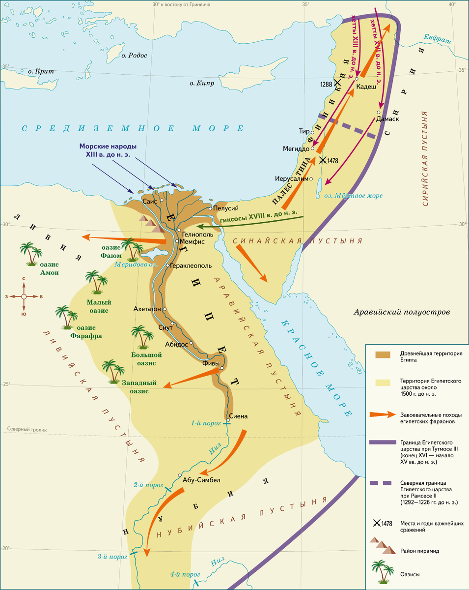 Египет был довольно богатым и самодостаточным государством. Но касалось это, в основном, продовольствия. Продовольствия в Египте было в избытке, но вот металлов, например, был недостаток. Это заставляло Египет заниматься обменом, торговлей с другими территориями, которые, в свою очередь, испытывали голод. И были не прочь пограбить зажиточный Египет. Сам по себе Египет тоже был отнюдь не миролюбив. Фараон пребывал в праздности, занимался военным делом и имел наемную армию в виде личной охраны, которую не против был пустить в дело. Население же Египта несло в том числе и воинскую повинность, видимо сравнимую с петровскими рекрутскими наборами, пожизненной службой. Существовало два основных направления военных походов фараонов. В Нубии добывали золото, также там захватывали рабов, это южное направление по устью Нила. Однако, золото не было ключевым металлом того времени, очень важны были медь и олово, из которых делали бронзу для изготовления оружия. Можно сказать, что век Египта был бро