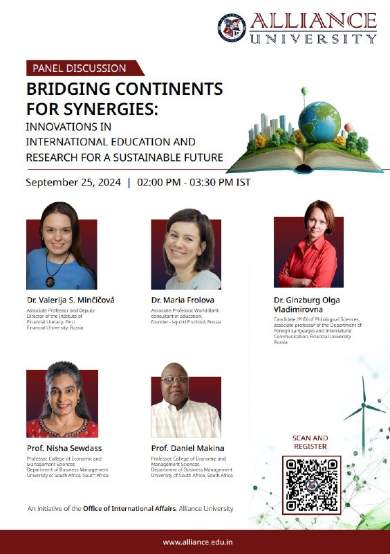 Двадцать пятого сентября состоялась панельная дискуссия «Объединяя континенты, достигнуть синергии: Инновации в международном образовании для устойчивого будущего», организованная Университетом Альянс (Индия). Главными спикерами мероприятия стали: На мероприятии в онлайн формате было представлено глубокое понимание инновационных подходов в международном образовании и научных исследованиях с особым акцентом на устойчивое развитие. С целью углубить свое понимание международного академического сотрудничества Беспалова Елена Александровна, проректор по международному сотрудничеству Тольяттинской академии управления, приняла участие в обсуждении. На мероприятии также обсудили новые тенденции в международном образовании и научных исследованиях, затронули вопросы устойчивых практик и глобального сотрудничества.