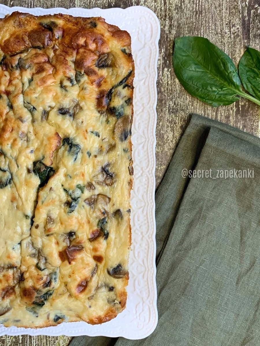 Про пользу шпината не говорил только ленивый. И по понятной причине я воздержусь) Примем это как данность – шпинат полезный и точка. Поэтому просто готовим вкусную, несложную, диетическую и очень симпатичную запеканочку. А в разрезе она просто вау-эффектная! Из чего будем готовить: - грибы шампиньоны 250 г - масло растительное 1 ст. л. и немного для формы - шпинат свежий 150 г - фарш куриный 450 г - сыр творожный 80 г - яйцо 3 шт. - чеснок сухой 1/2 ч. л. - соль, перец Форма 26*11,5*7,5 см. Грибы зачищаем от остатков земли и ополаскиваем. Далее каждый гриб разрезаем пополам, кладём срезом на доску и нарезаем вдоль тонкими пластинами. В сковороду наливаем ложку масла и обжариваем грибы до полного испарения влаги. Немного подсаливаем. Шпинат также тщательно промываем, удаляем ножки и нарезаем листья полосками поперёк. Выкладываем его к грибам, даём слегка обмякнуть и отставляем сковороду в сторону. Фарш перекладываем в глубокую миску. Добавляем сыр, яйца и специи. Всё п