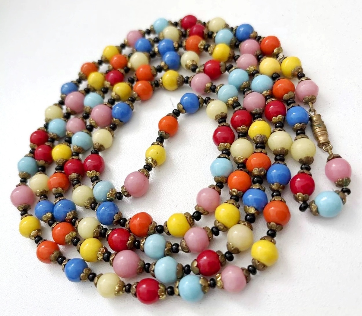 В настоящее время украшения из арлекинового стекла достаточно востребованы на рынке винтажной бижутерии. Цена на них не является запредельной, хотя достаточно высока, так как количество подобных изделий в продаже невелико. Арлекиновое стекло (Harlequin glass) представляет собой вид матового или глушеного стекла яркой разнообразной расцветки. Такое стекло не выцветает на солнце благодаря особенной технологии производства и является одним из вариантов смальты. Что касается истории и времени появления, то до сих пор я не встречала подробных статей о точной дате их производства. Большие сомнения вызывают описания продаваемых на зарубежных площадках изделий, где утверждается, что они выполнены в стиле ар-деко в 20-х годах двадцатого столетия. Во-первых, это явно не ар-деко. Во-вторых, такие бусы точно продавались в магазинах Чехословакии в конце 60-х. Думаю, что их производство приходилось на 50-е – начало 70-х годов прошлого столетия. Какое-то время такие бусы могли продаваться в Чехослова