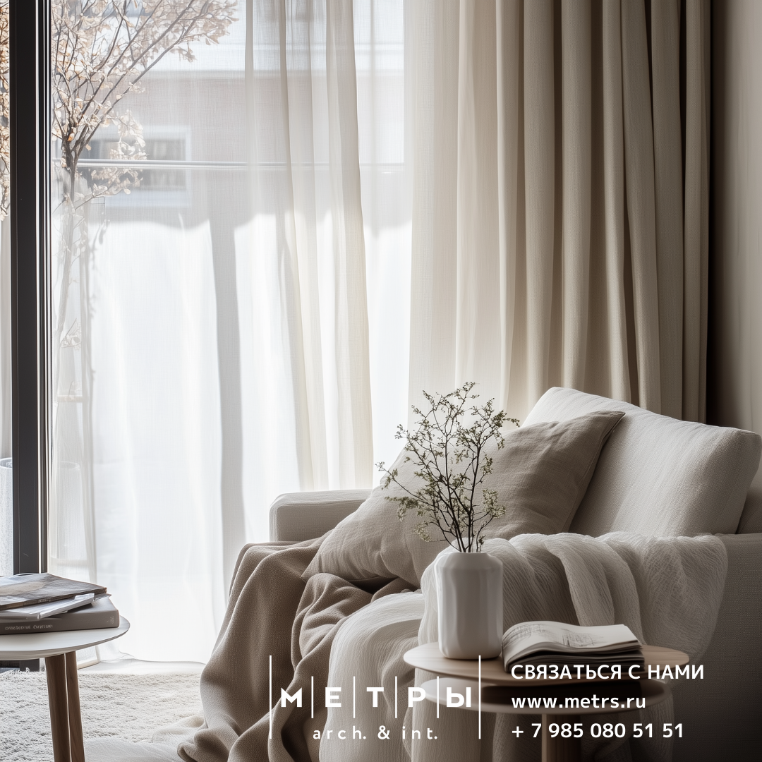 - Шторы: Легкие, полупрозрачные шторы добавляют пространству мягкость и интимность, сохраняя при этом естественный свет. Для большей уюта можно использовать более плотные и текстурированные ткани, которые обеспечат приватность и создадут уютную атмосферу.