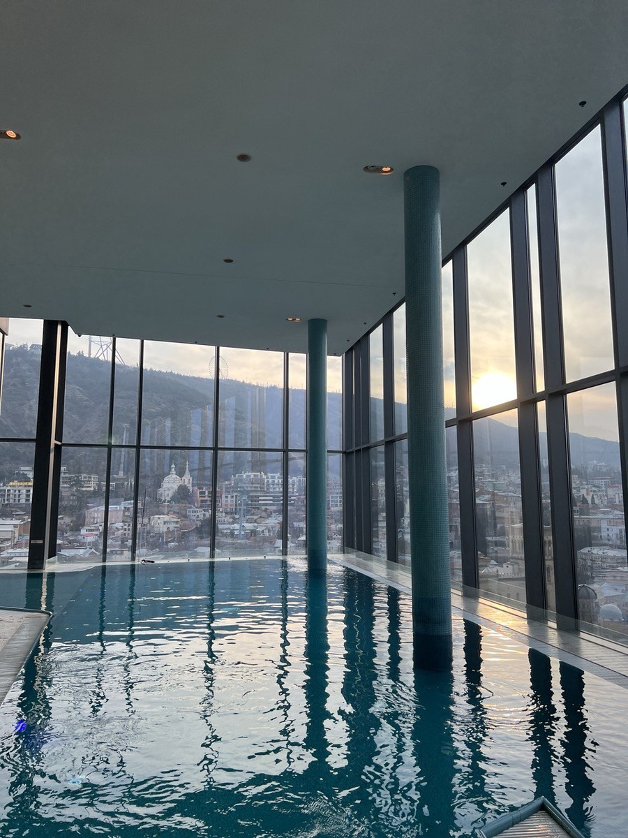 И еще одна рекомендация от меня в Тбилиси — бассейн с панорамным видом в отеле Radisson Blu Iveria. Если вы не рискуете опробовать те самые Тбилисские бани с сероводородом, то советую сделать выбор в пользу этого места. Сюда лучше приходить днем, чтобы насладиться волшебным видом на весь город и спокойной атмосферой. Классно, что роскошным видом можно любоваться не только в бассейне, но и в сауне, и в солярии, и в зоне отдыха. Что понравилось: расположение в центре города, чистота, наличие всего необходимого (тапочки, халат, шампунь, хороший фен и тд.), много пространства и ничего лишнего. Мы были в районе 16 часов, из людей не было никого 🤍 #путешествуемсвикой | интересная жизнь