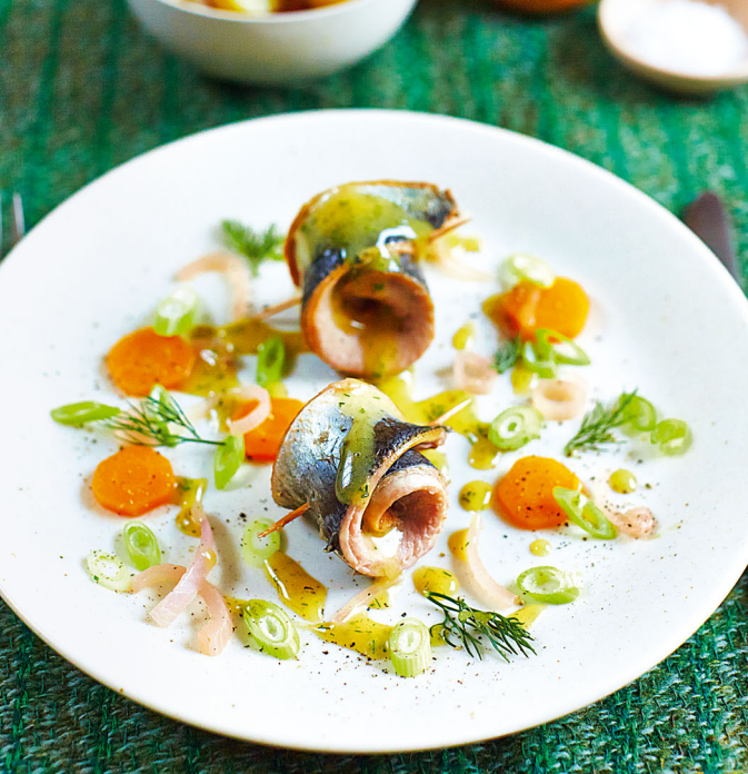 - Достаньте свернутые филе сельди из маринада и разложите по тарелкам вместе с морковью и красным луком из маринада.