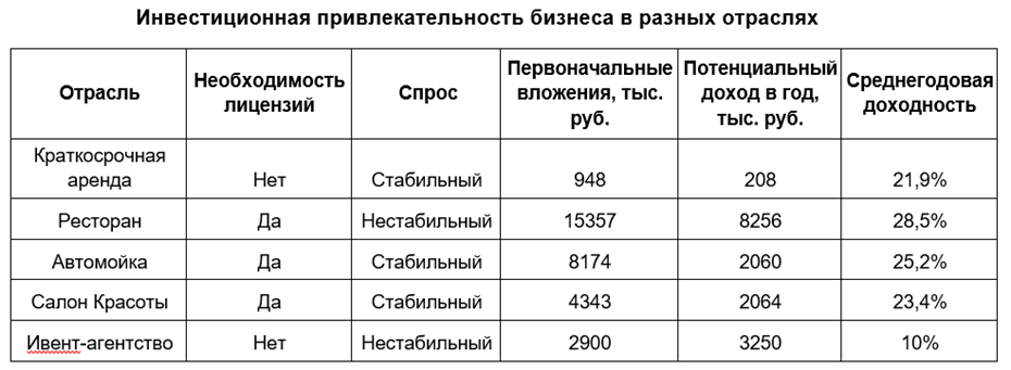 По мнению участников рынка, бизнес краткосрочной аренды недвижимости стал одним из самых лёгких для старта, поскольку доступен для всех, у кого есть пригодное для сдачи жильё. Кроме того, здесь почти не требуется большой объём вложений. По оценкам специалистов, средний порог входа в бизнес составляет менее миллиона рублей при потенциальном ежегодном доходе 208 тыс. рублей, а среднегодовая доходность бизнеса достигает 21,9%. Для сравнения: открытие ресторана с нуля обойдётся в 16 раз дороже.
