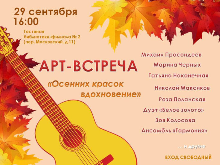 В воскресенье, 29 сентября, в Камышине состоится арт-встреча «Осенних красок вдохновение»! Перед гостями выступят известные авторы-исполнители. Среди них: Михаил Просондеев, Марина Черных, Татьяна Наконечная, дуэт «Белое золото» и другие. Стихотворную часть вечера наполнят поэзией Николай Максиков, Роза Поланская и другие.