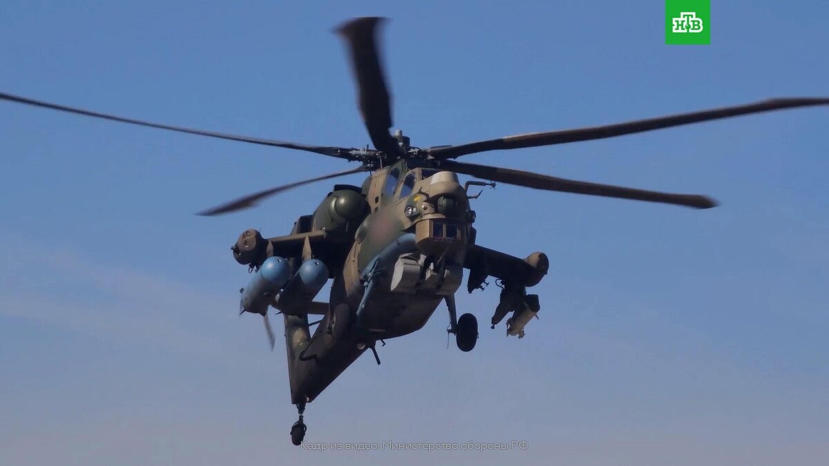 [ Смотреть видео на сайте НТВ ] Минобороны России показало кадры удара вертолета Ми-28 по силам и технике ВСУ в приграничье. Российское военное ведомство распространило видеоролик, в котором показана подготовка вертолета Ми-28 к вылету, полет и применение ракет. Удар был нанесен по силам и технике неприятеля. Минобороны России: «Экипаж армейской авиации на вертолете Ми-28НМ нанес удар авиационными средствами поражения по скоплению живой силы и бронированной технике подразделений ВСУ в приграничном районе Курской области». [ Смотреть видео на сайте НТВ ]