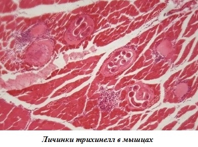 Иногда встречаются обызвествленные капсулы, в которых личинки трудно рассмотреть. Для их просветления срезы мышц следует поместить в чашку Петри с 5-10%-ным раствором соляной кислоты и поставить в термостат при 37°С на 20-30 мин. Затем срезы мышц переносят в компрессорий и микроскопируют. Для дифференциации обызвествленных трихинелл от обызвествленных саркоцист и конкрементов нетрихинеллезной природы проводят окраску срезов по методу Ямщикова. Метод этот применим для исследования соленого и мороженого мяса. Срезы расплющивают между стеклами компрессория, затем снимают и погружают на 1-2 мин. в 1%-ный раствор риванола (или камалы, акрихина, трипафлавина), приготовленного на 5%-ном растворе едкого натрия. После этого срезы переносят на 1-2 мин. в сосуд с насыщенным раствором метиленового голубого (15 г на 100 мл 80%-ной уксусной кислоты). Затем срезы тщательно промывают в горячей воде (80-90°С), вновь раскладывают на стекле компрессория и исследуют. Если срезы оказались густо окрашенными