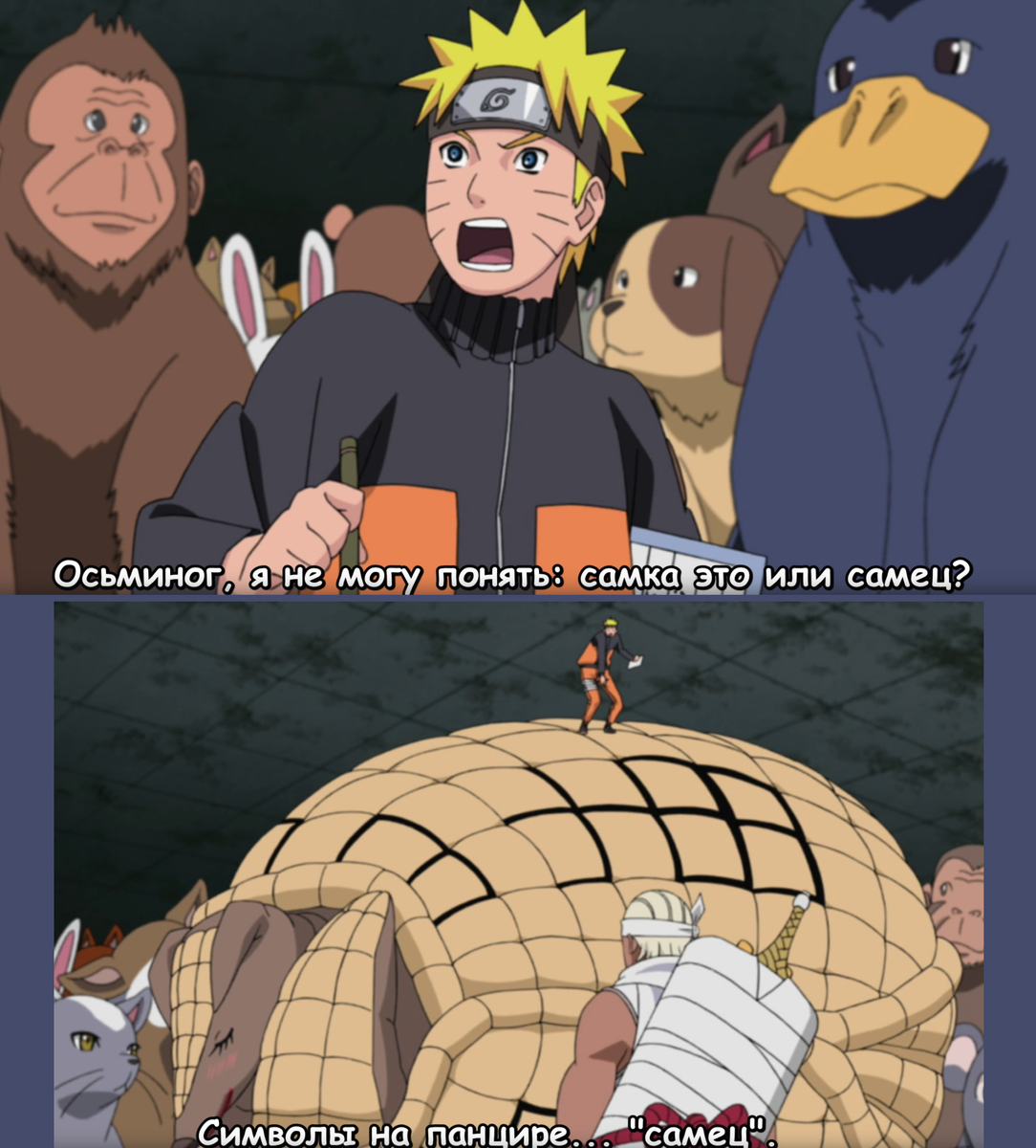 Забавный момент заключается в том, что в АНИМЕ эту сцену зацензурили, и мы видим, что... ну Наруто и сражавшиеся за сердце Броненосца звери ВСЁ ПОНЯЛИ, взглянув ему между ног. Хотя, по факту там просто гладкая поверхность...