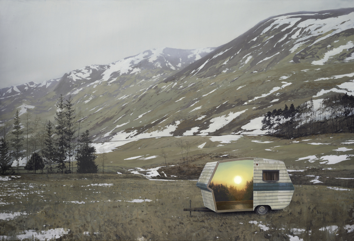 Я вам уже показывала работы шотландца Эндрю Макинтоша и его серию «Мечтатели», очень он мне нравится. И вот нашла еще одну его серию Where We Belong. Пожалуй, я бы это перевела как «То, где наше место», дословно «То место, которому мы принадлежим». Если у вас есть свои идеи, как это лучше перевести, делитесь, пожалуйста. Честно говоря, описание серии не дает полной ясности в интерпретации, но содержит подсказки. Трейлеры-порталы как будто символизируют размывание границ между реальным миром и вымышленным. Например, это может быть желание сбежать от унылой действительности в иное чудесное место. И эти трейлеры превращаются в метафоры, воплощающие наши несбыточные мечтания о лучшей жизни, путешествиях и приключениях. Потрепанные трейлеры похожи на разбившиеся надежды и амбиции, которые в молодости кажутся достижимыми и возможными, но по прошествии многих лет так и не сбываются. Сияющие и манящие пейзажи внутри трейлеров могут говорить о том, что несмотря на то, что все складывается не