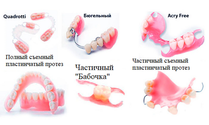 Съемные протезы делятся на полные и частичные, то есть которые восстанавливают все зубы или только некоторые. Также они подразделяются на пластинчатые-состоящие полностью из пластмассы и опирающиеся целиком на слизистую и бюгельные, которые имеют каркас и частично опираются на зубы. Также они могут изготавливаться из различных видом пластмасс, будь то акриловые или безакриловые. Иногда бывают на 1 зуб, их называют "бабочками" или "жучками".