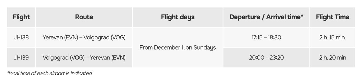 С 1 декабря 2024 года из Волгограда начнут чаще летать самолеты в столицу Армении. О полетной программе объявила Armenian Airlines. Совершать рейсы перевозчик планирует раз в неделю — по воскресеньям. В Волгограде Airbus 321−200 будет приземляться в 18:30, а вылетать обратно в Ереван — в 20:00. Время полета составляет около 2 часов 20 минут. Авиакомпания разрешает бесплатно провозить ручную кладь до 7 кг габаритами 55×40×20см. Стоимость билетов составляет около 8 тысяч рублей. Еще больше актуальных новостей — в нашем телеграм-канале. Петр Ефремов