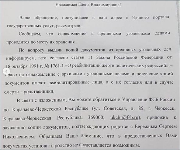 Так вот - в качестве эксперимента отправила запрос через сайт Госуслуг с неполным перечнем документов. Как результат - пришла архивная справка из архива ФСБ по КЧР и приглашение в гости смотреть само дело. (Для новеньких - есть немного в вечных сторис - кружки под шапкой аккаунта). Я написала опять на гос.услуги вопрос, в каких случаях присылают копии, а в каких надо самому ехать.