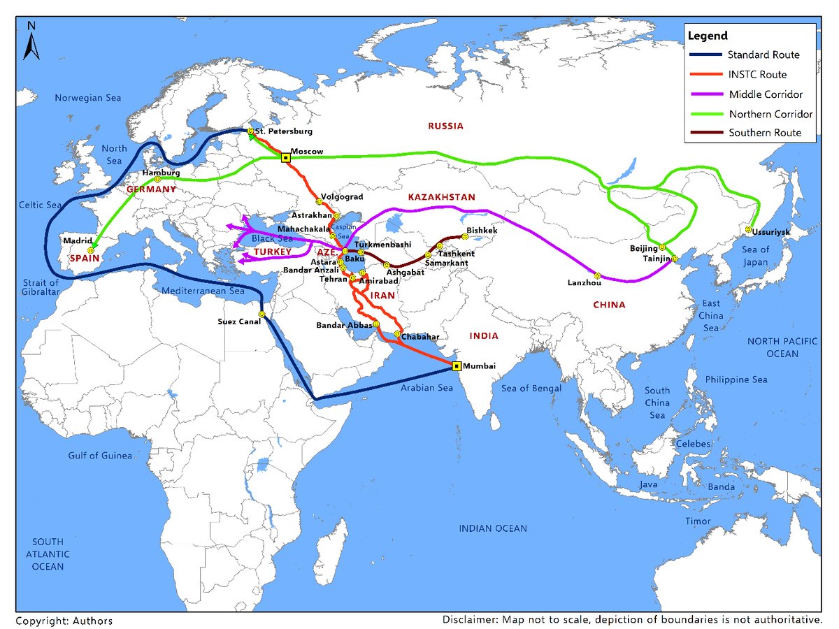 Map 1: INSTC, Middle Corridor, Northern Route, and Standard Route