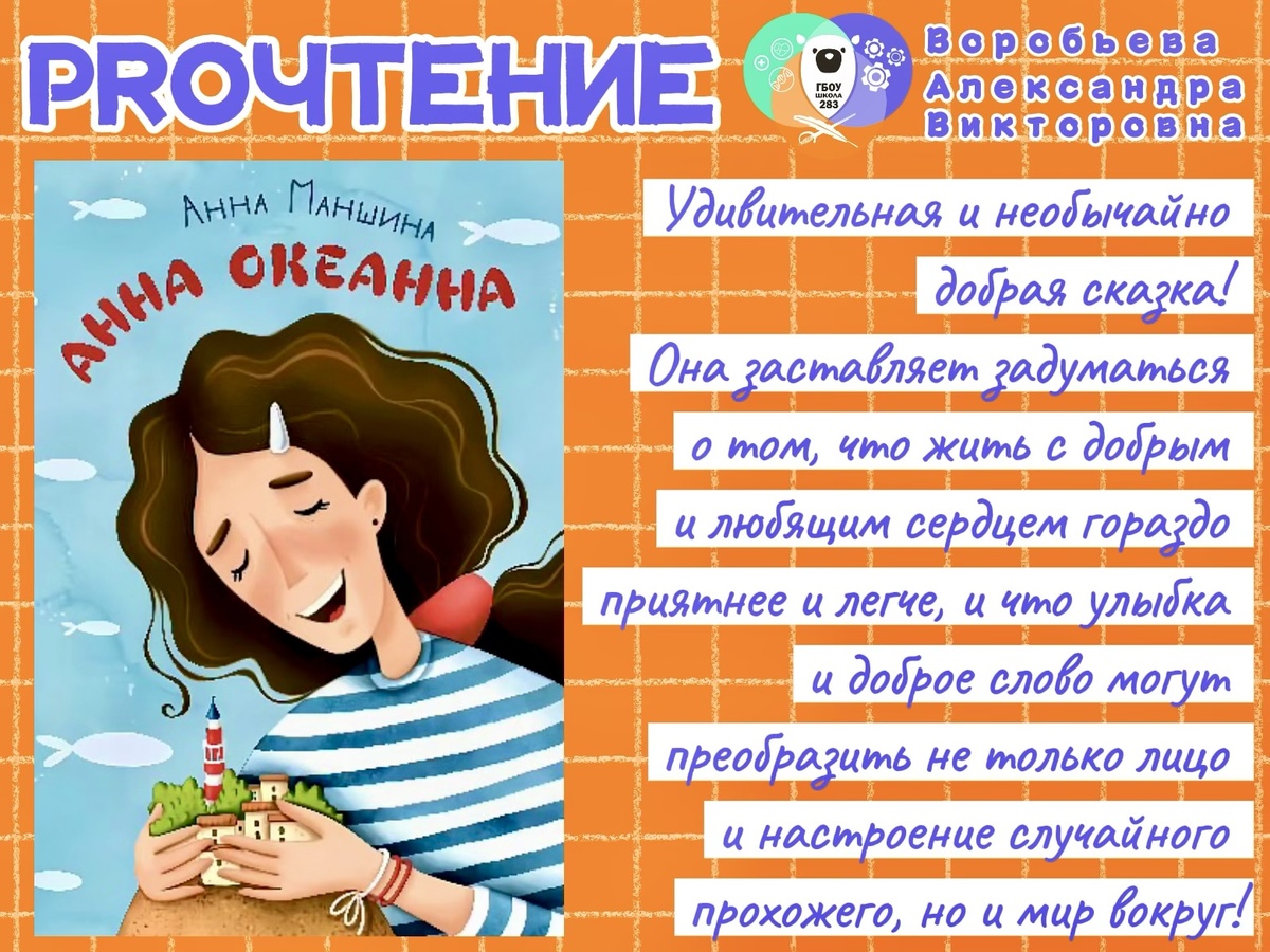 🙋🏻♀️ Традиционная авторская колонка от методиста нашей школы, журналиста с многолетним стажем, Александры Викторовны Воробьевой https://vk.com/sanechka78. ☝🏻 Скажу сразу, книгу Анны Маншиной «Анна Океанна» купила чисто для себя. Захотелось чего-то такого, с запахом моря и соленой карамели… 🏝️ Однажды на маленьком острове появляется незнакомка в цветастой юбке и поселяется в старом домике у маяка. ❓ Жители спрашивают друг у друга, кто она, эта таинственная Анна? Почему она так любит океан, шторм и ветер? Как у нее получается слышать и понимать морских существ? 🌊 Загадочную незнакомку дети прозвали Анна Океанна. И именно с ними она быстро нашла общий язык: она рассказывает им лучшие в мире сказки про чаячьи острова, знакомый ветер-путешественник, про парусные лодки и пиратов. А еще любит соленую карамель, гуляет под проливным дождем, плетет разноцветные браслеты из ниток, получает почту в бутылках, прибивающихся к берегу, дружит с ветрами (даже занавески в доме развешивает