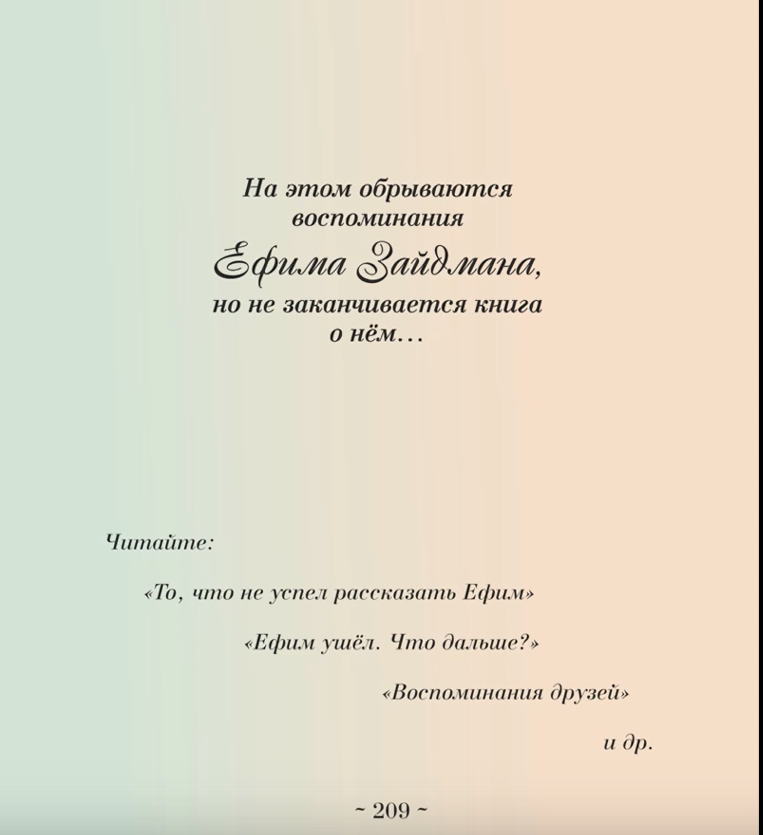 Как-то даже в какой-то мере жаль, что работа над книгой подошла к завершению. И хотя между мной и языком эсперанто непреодолимая пропасть, я всегда ждала с нетерпением новое письмо, новую главу, перечитывала с большим интересом, восхищаясь, что в нашем маленьком городе жили такие увлеченные Люди, не побоюсь сказать, мирового уровня и масштаба (ведь сколько теплых слов и воспоминаний о Ефиме Семёновиче Зайдмане объединили на страницах книги