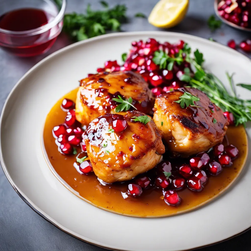 Необходимые ингредиенты: • 4 куриных бедра (желательно с кожей) • 2 столовые ложки жидкого меда • 1 свежий гранат (зерна) • 4-5 картофелин среднего размера • 2-3 зубчика чеснока • 1 чайная ложка свежего розмарина (или ½ чайной ложки сушеного) • Соль и свежемолотый черный перец по вкусу • Оливковое масло • Лимон для подачи Инструкция по приготовлению: 1. Подготовка картофеля: • Разогрейте духовку до 200°C. • Очистите картофель и нарежьте его на крупные кубики. Выложите в жаропрочную форму, добавьте соль, перец и сбрызните оливковым маслом. Хорошо перемешайте. 2. Приготовление маринада для курицы: • В небольшой миске смешайте мед, прессованный чеснок, нарезанный розмарин, соль и перец. Перемешайте до получения однородной массы. • Обмажьте куриные бедра маринадом, чтобы они хорошо пропитались. 3. Сборка блюда: • Разместите куриные бедра на картофельной подушке в форме для запекания. Сверху равномерно распределите зерна граната. • Накройте форму фольгой и поставьте в разогретую духовку. З