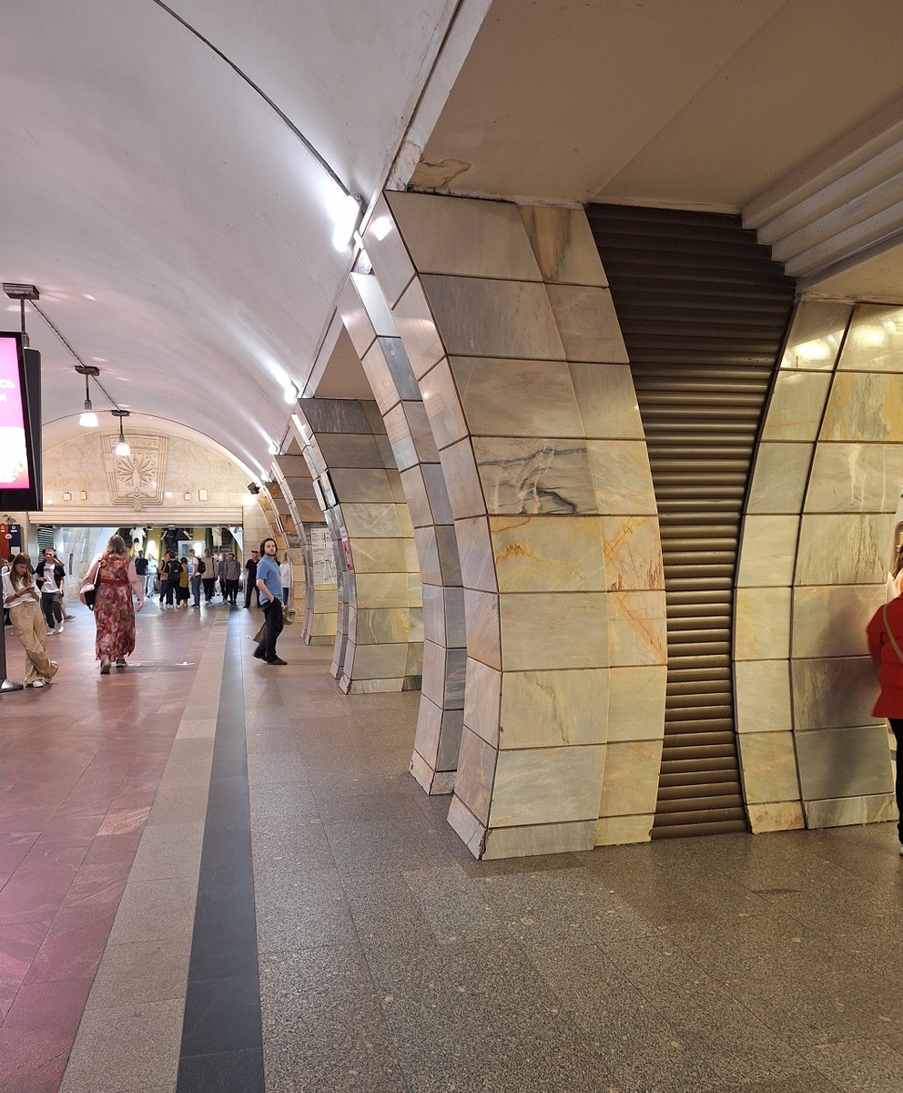 Облицовка пилонов идет мрамором «газган» (сколько видов мрамора я узнала при путешествиях по метро Москвы!), теплые тона мрамора разбавлены металлическими вставками. Над выходом и переходом мы видим гербы Серпухова.