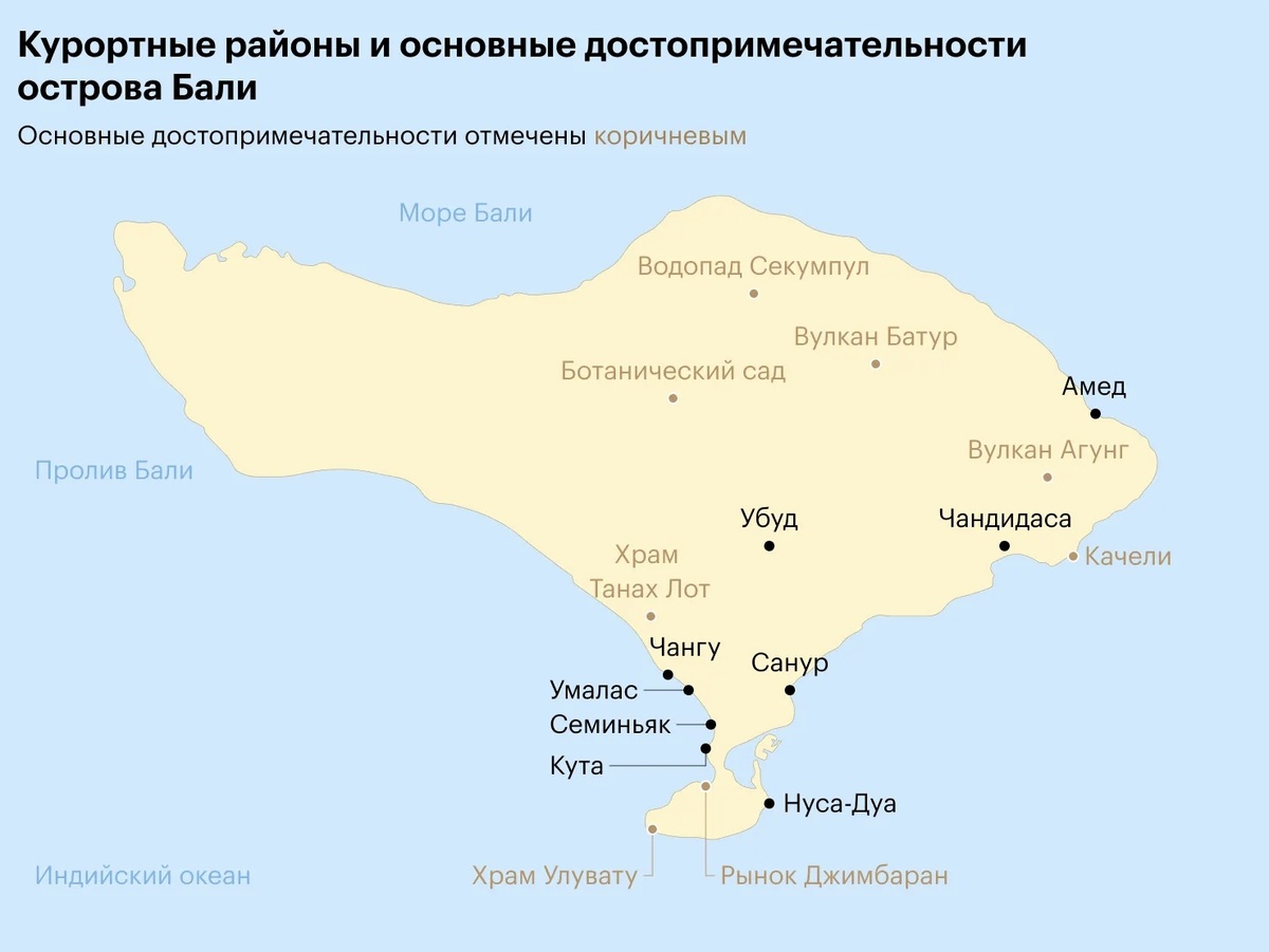 На Бали несколько туристических районов со своими особенностями. При их выборе рекомендую учитывать время года. В сезон дождей полноводные реки выносят мусор, бревна и сточную воду в океан с западной стороны острова, поэтому пляжи Куты, Семиньяка и Чангу становятся грязными. Нуса-Дуа находится на полуострове Букит на юге Бали. Это территория отелей «все включено». Там хорошие песчаные пляжи со спокойной водой, но до интересных мест острова далеко. Сюда едут за пакетным отдыхом, чтобы лежать на пляже и ничего не делать. На мой взгляд, это бессмысленно: дешевле слетать в Турцию или Египет. Район Нуса-Дуа занимает небольшую часть Букита. На других пляжах высокие обрывы и хорошие волны, но не для новичков. Здесь селятся опытные серферы. Кута и Семиньяк — классические азиатские курортные зоны. Вдоль дорог стоят палатки с типичными сувенирами, зазывалы предлагают экскурсии и приглашают в спа-салоны.В лавках завышают цены, а обсчитывать пытаются даже в магазинах. В Куте и Семиньяке кипит ноч