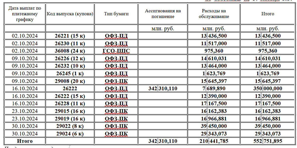 После января - сентября: Минфин опубликовал данные о выплатах по ОФЗ в октябре 2024 года. В связи с погашением выпуска 26222 сумма выплат в октябре будет второй в этом году, после июля, 552 млрд. руб. Диаграмма по выплатам с начала года. Удачи и трезвого анализа в ваших инвестициях!!! P.S. Подписывайтесь на мой телеграмм-канал: https://t.me/Cervonets