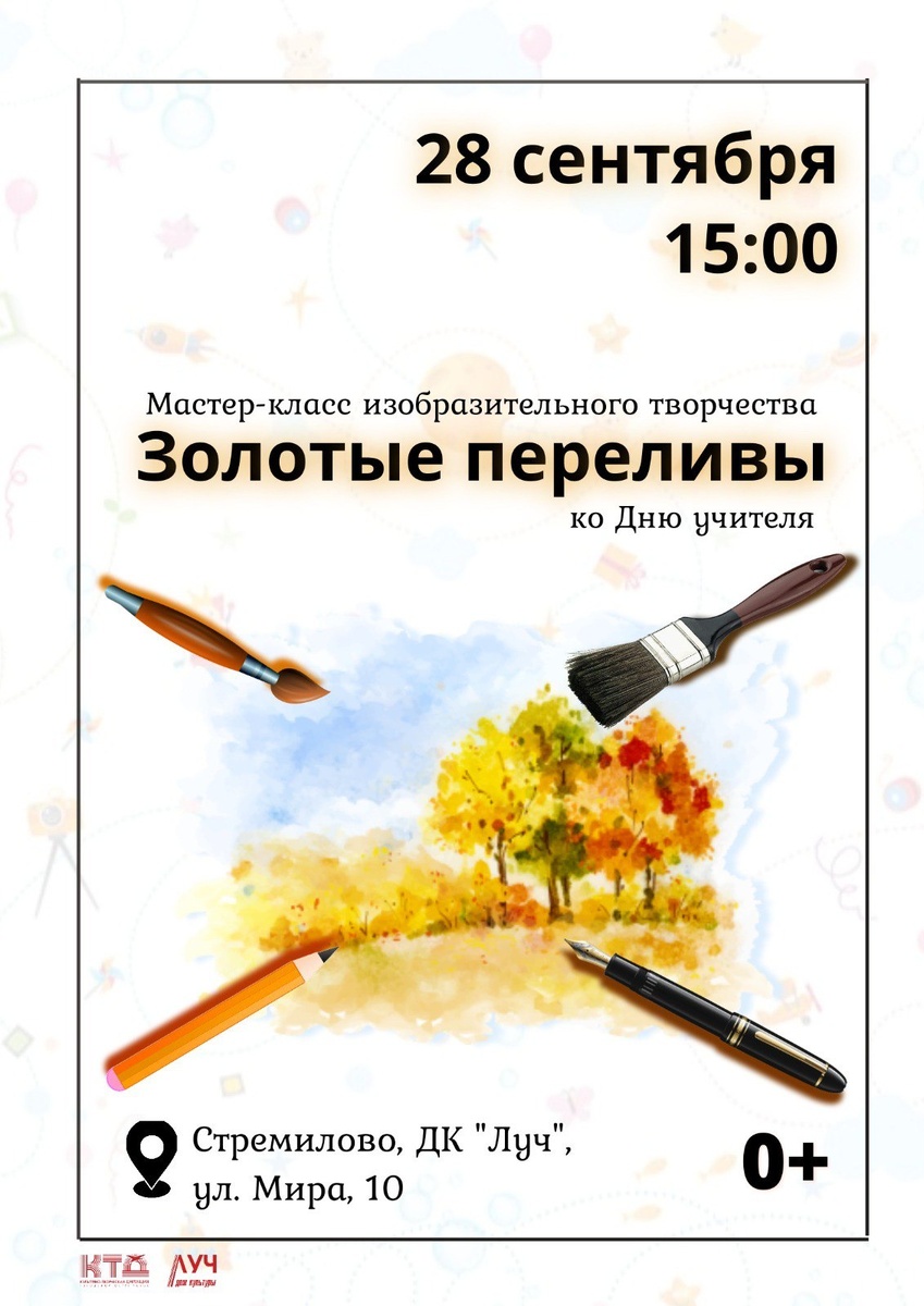 💥 Мастер-класс изобразительного творчества ко Дню учителя «Золотые переливы» в ДК «Луч» г.о. Чехов Ждем жителей и гостей Стремилово в гости. Будет интересно! 😎👍🏻 📶 Категория: Прочие 🚫 Возраст: 0+ 📆 28.09.2024 🕕 15:00 🏢 ДК «Луч» 📍 г.о. Чехов, с. Стремилово, ул. Мира, стр.10 🪙 Стоимость билетов - Бесплатно❗️ #ДКЛуч #Стремилово #ГоспабликиМО #ГородскойОкругЧехов